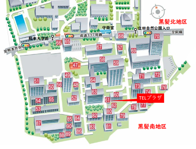 熊本大学 黒髪南キャンパス TELプラザ講義室 黒髪南地区キャンパスマップの61番の建物 交通機関でのアクセス方法は、 交通案内ページ をご参照ください。 |