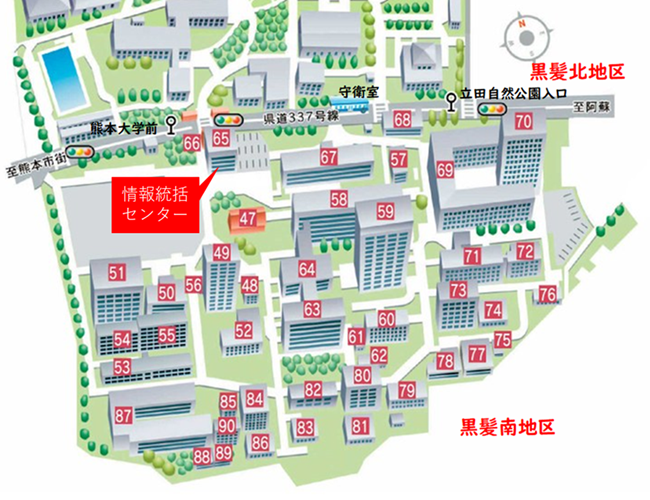 熊本大学 黒髪南地区キャンパス 情報統括センター3階PC実習室 黒髪南地区キャンパスマップの65番の建物 交通機関でのアクセス方法は、 交通案内ページ をご参照ください。 |