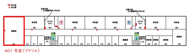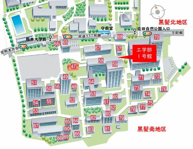 熊本大学 黒髪南地区キャンパス 工学部1号館A401(アトリエ) 黒髪南地区キャンパスマップの58番の建物 交通機関でのアクセス方法は、 交通案内ページ をご参照ください。 |
