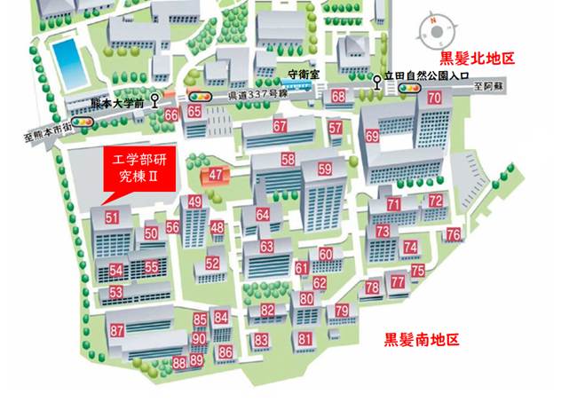 熊本大学 黒髪南地区キャンパス 工学部研究棟U(旧物質生命科学科)1階実験室 黒髪南地区キャンパスマップの51番の建物 交通機関でのアクセス方法は、 交通案内ページ をご参照ください。 |